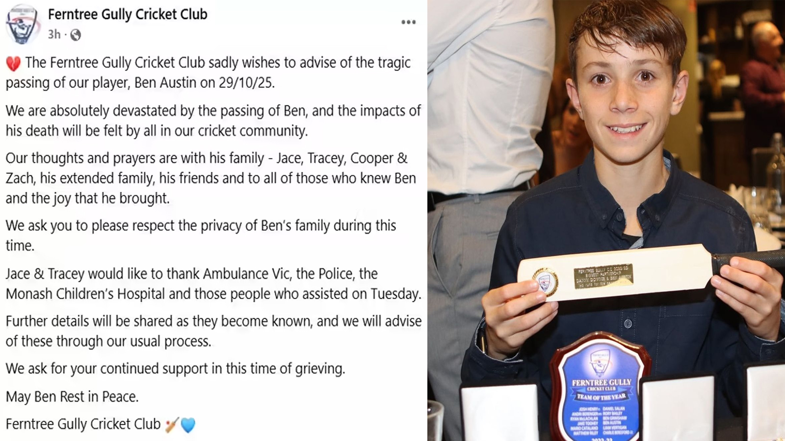 बेन ऑस्टिन की मौत के बाद फर्नट्री गली क्रिकेट क्लब ने गुरुवार सुबह सोशल मीडिया पर एक पोस्ट शेयर किया और लिखा हम बेन के निधन से बहुत दुखी है। वो न केवल एक शानदार खिलाड़ी थे, बल्कि एक बेहतरीन लीडर और बहुत अच्छे इंसान भी थे। उनके जाने से हमारे पूरे क्रिकेट क्लब को गहरा झटका लगा है। क्रिकेट क्लब ने उनके परिवार के प्रति संवेदनाएं व्यक्त की और कहा कि ये नुकसान कभी नहीं भरा जा सकेगा।