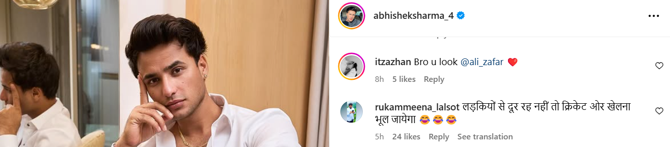 एक इंस्टाग्राम यूजर ने अभिषेक शर्मा के धांसू पोस्ट को देखने के बाद बड़ी सलाह दी है। उन्होंने कमेंट करते हुए लिखा कि "लड़कियों से दूर रहिए, नहीं तो क्रिकेट खेलना भूल जाइएगा।" यूजर का यह मजेदार कमेंट वायरल हो रहा है।