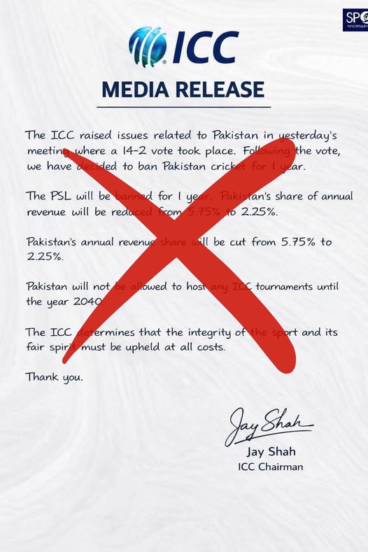 इस प्रेस रिलीज में कहा गया है कि ICC बोर्ड मीटिंग में भारत के खिलाफ मैच का बहिष्कार करने के पाकिस्तान के फैसले पर चर्चा हुई और 14-2 के बहुमत से पाकिस्तानी टीम पर एक साल का बैन लगाने का फैसला किया गया। इसके अलावा, यह भी दावा किया गया है कि पाकिस्तान की घरेलू T20 लीग, PSL पर भी एक साल का बैन लगाया गया है और ICC से पाकिस्तान को मिलने वाला सालाना हिस्सा 5.75% से घटाकर 2.25% कर दिया गया है। वायरल हो रही इस चिट्ठी में यह भी लिखा है कि 2040 तक पाकिस्तान को किसी भी ICC टूर्नामेंट की मेजबानी नहीं दी जाएगी।