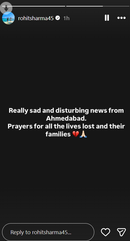 इसके अलावा टीम इंडिया के वनडे कैप्टन रोहित शर्मा ने भी इस विमान हादसे पर दुख जताया है। उन्होंने अपने इंस्टाग्राम अकाउंट पर स्टोरी शेयर की है और लिखा है "अहमदाबाद से बहुत ही दर्दनाक और दुखद खबर आई है।"