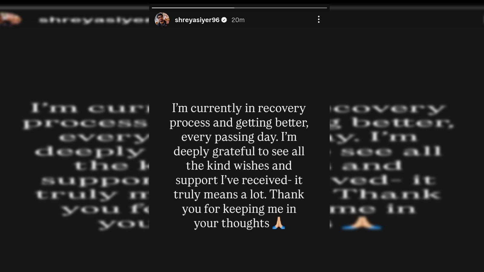 इंस्टाग्राम पर श्रेयस अय्यर ने अपने ऑफिशियल पेज पर इंस्टा स्टोरी शेयर की, इस पोस्ट में उन्होंने लिखा- मैं अभी ठीक हो रहा हूं और हर गुजरते दिन के साथ बेहतर होता जा रहा हूं। मुझे मिली सभी शुभकामनाओं और समर्थन के लिए मैं बहुत आभारी हूं। मेरे लिए यह वाकई बहुत मायने रखता है। मुझे अपने विचारों में रखने के लिए धन्यवाद। सोशल मीडिया पर अय्यर का ये पोस्ट खूब वायरल हो रहा है।