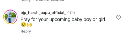सूर्यकुमार यादव के द्वारा गणेश चतुर्थी पर शेयर किए गए इस पोस्ट पर उनके फैंस खूब प्यार लुटा रहे हैं। कोई गणपति बप्पा मोरया लिख रहा है, तो कोई उनकी जोड़ी को पसंद कर रहा है। इसी बीच एक फैन ने गणपति बप्पा से दोनों के लिए बेबी गर्ल/बेबी बॉय के लिए आशीर्वाद भी मांगा। जी हां, एक फैन ने कमेंट बॉक्स में लिखा "आपके आने वाले बेबी गर्ल या बॉय के लिए प्रार्थना।" इसके अलावा एक और फैन ने लिखा "सूर्य भाऊ कुर्ता खुप भारी आहे" जिसका हिंदी मतलब होता है"सूर्या भाई आपके ऊपर कुर्ता खूब प्यारा लग रहा है।"