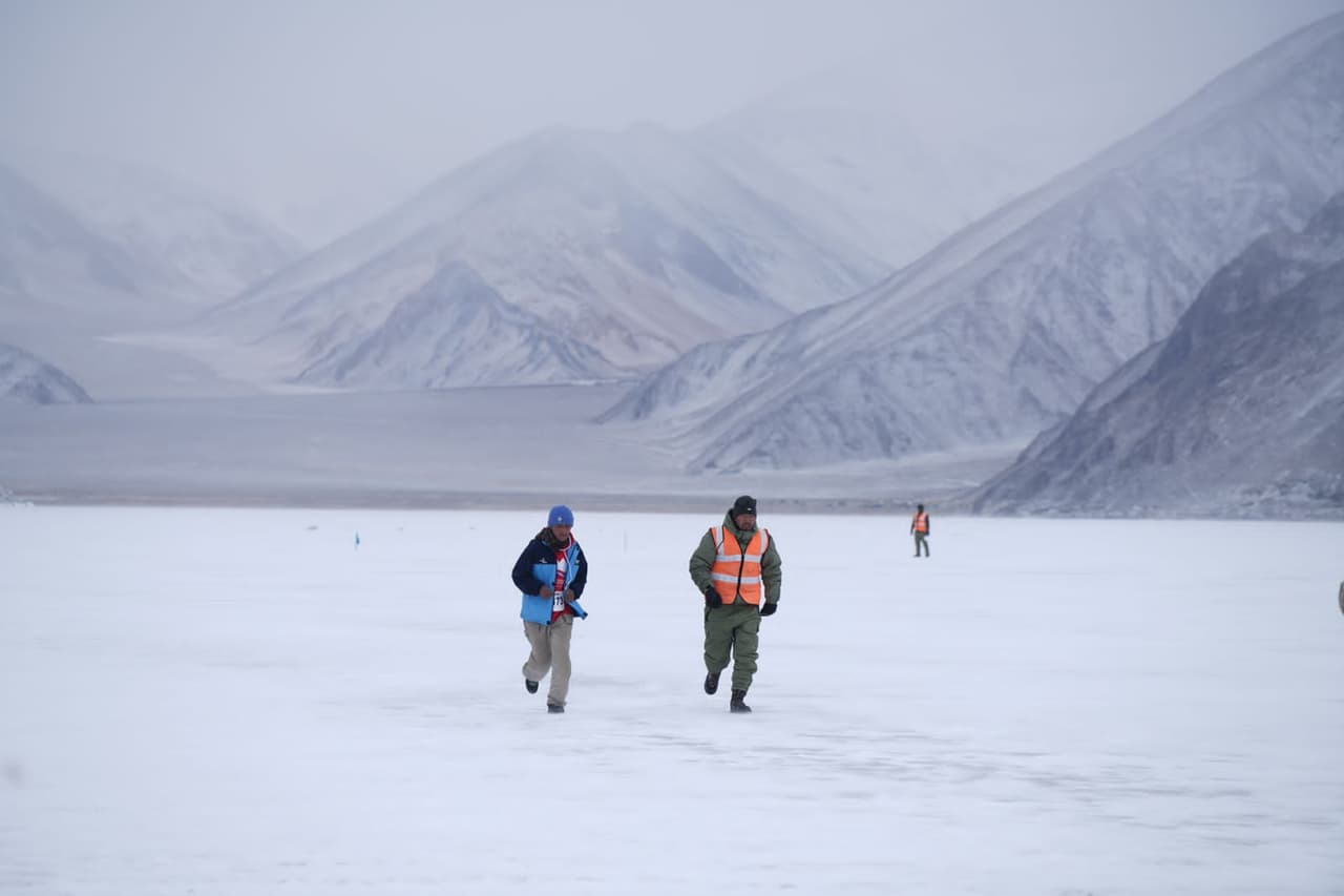 Pangong frozen lake marathon: पैंगोंग फ्रोजन लेक मैराथन का दूसरा संस्करण मंगलवार को संपन्न हुआ। दुनिया की इस सबसे ऊंची फ्रोजन लेक मैराथन में धावकों का उत्साह देखते ही बन रहा था।