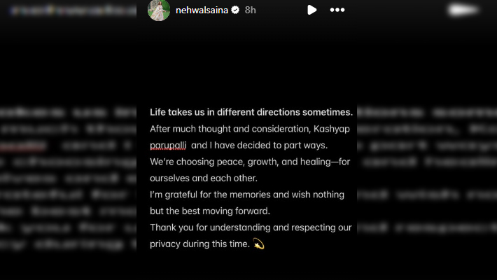 साइना नेहवाल ने अपने ऑफिशियल इंस्टाग्राम अकाउंट पर एक स्टोरी पोस्ट करके लिखा- 'जिंदगी कभी-कभी हमें अलग-अलग दिशाओं में ले जाती है बहुत सोच विचार के बाद पारुपल्ली कश्यप और मैंने अलग होने का फैसला किया है। हम अपने और एक दूसरे के लिए शांति, ग्रोथ और अच्छी सेहत चुन रहे हैं। मैं उन यादों के लिए आभारी हूं और आगे के लिए शुभकामनाएं ही चाहती हूं।' सोशल मीडिया पर साइना नेहवाल का यह पोस्ट तेजी से वायरल हो रहा है। साइना ने इस कठिन समय के दौरान कश्यप और उनकी प्राइवेसी को समझने के लिए फैंस का धन्यवाद भी दिया।