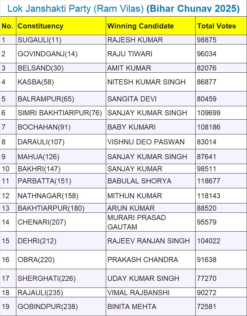 Bihar Election 2025 : बिहार विधानसभा चुनाव में केंद्रीय मंत्री चिराग पासवान की पार्टी लोक जनशक्ति पार्टी (लोजपा) ने 29 में से 19 सीटें जीतीं। उनका स्ट्राइक रेट तेजस्वी और राहुल गांधी से भी बेहतर रहा।