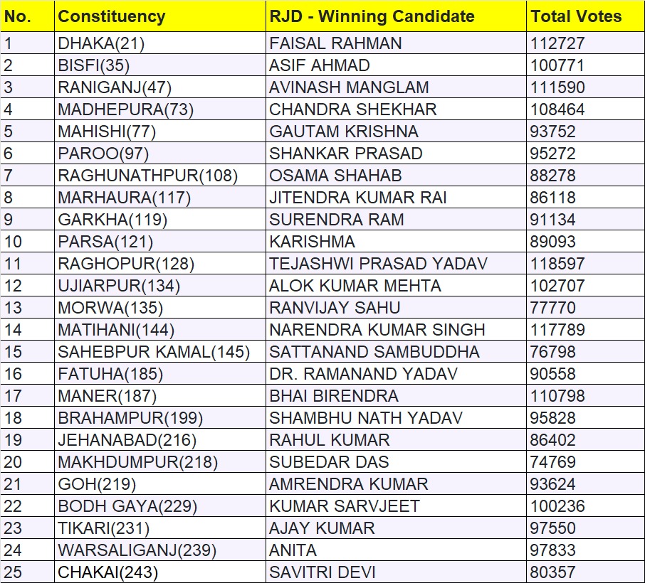 बिहार में सरकार बनाने का दावा करने वाले तेजस्वी यादव की पार्टी आरजेडी की इतनी बुरी हार होगी किसी ने सोचा नहीं था। एक तरफ एनडीए को जीतकर प्रचंड बहुमत हासिल किया। वहीं RJD को 25 सीटें मिलीं। आइए देखते हैं इन 25 विनर कैंडिडेट्स की लिस्ट…