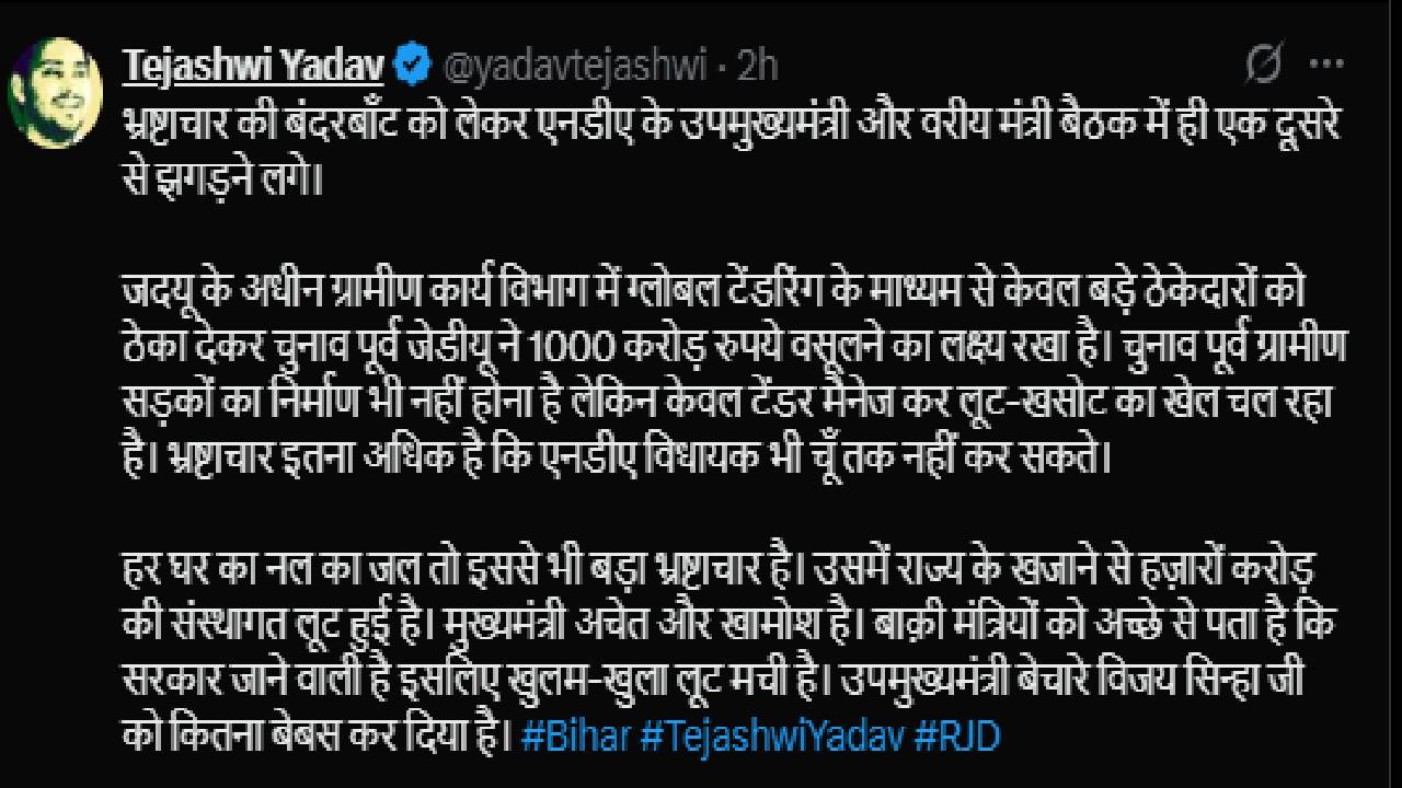 इस बहस के बाद नेता प्रतिपक्ष तेजस्वी यादव ने सोशल मीडिया पर एनडीए के दोनों सहयोगी दलों भाजपा और जेडीयू पर तीखा हमला बोला।