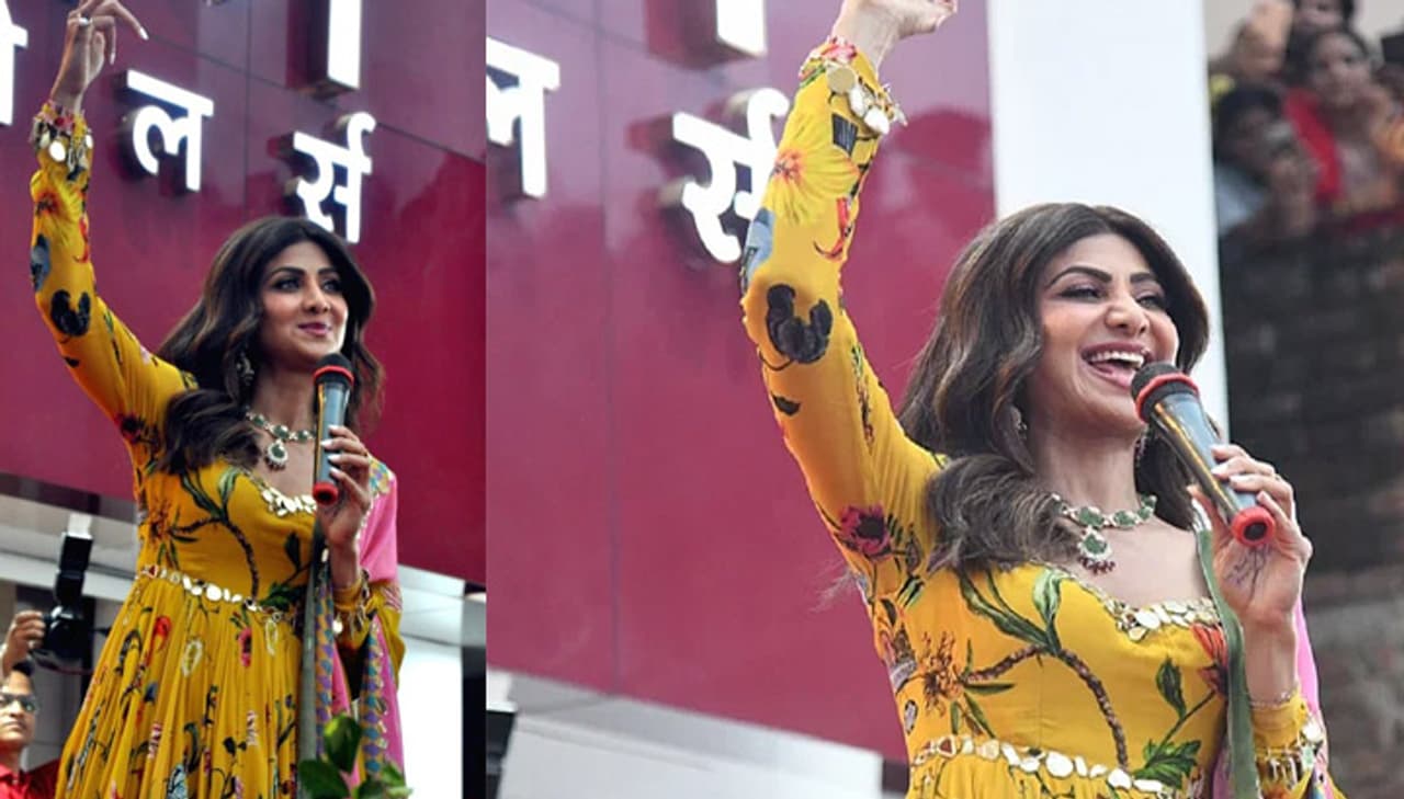 ज्वेलर्स के शोरूम का उद्घाटन करने से पहले शिल्पा शेट्टी ने मंच से लोगों से बातचीत की।