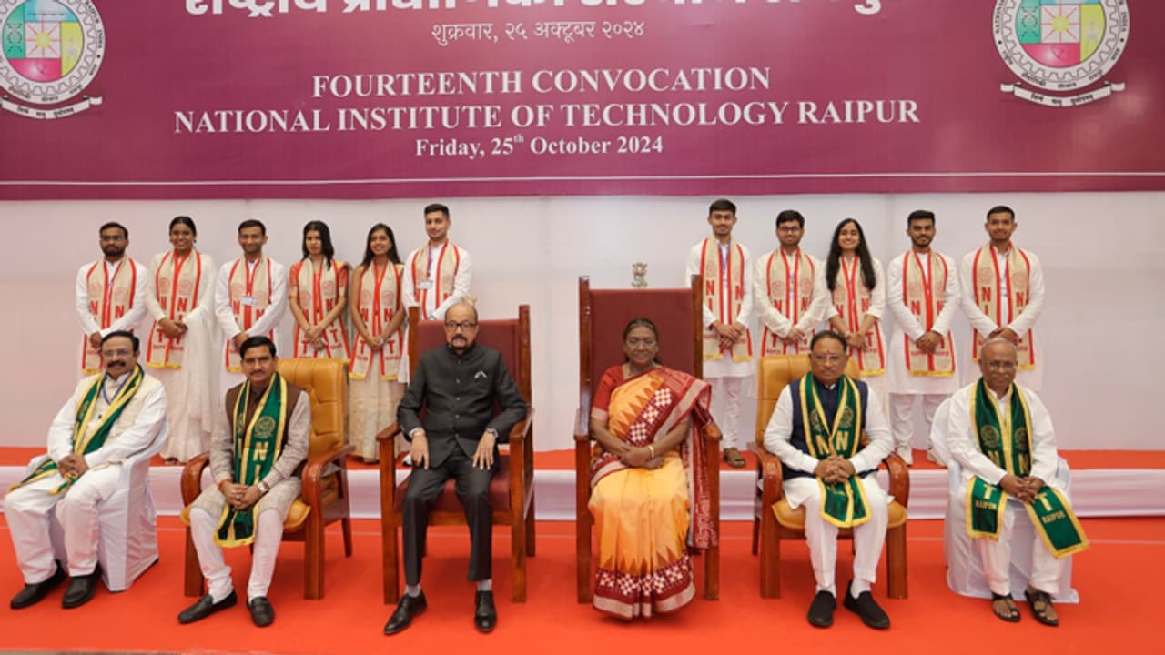 रायपुर। राष्ट्रीय प्रौद्योगिकी संस्थान, रायपुर के लिए 25 अक्टूबर का दिन ऐतिहासिक रहा। देश की राष्ट्रपति श्रीमती द्रौपदी मुर्मु ने आज संस्थान के 14वें दीक्षांत समारोह में अपनी गरिमामय मौजूदगी दी और 12 होनहार विद्यार्थियों को उनकी बेहतरीन शैक्षणिक उपलब्धियों के लिए अपने हाथों से स्वर्ण पदक प्रदान किया। राज्यपाल श्री रमेन डेका, मुख्यमंत्री श्री विष्णु देव साय और केन्द्रीय राज्य मंत्री श्री तोखन साहू भी दीक्षांत समारोह में विशिष्ट अतिथि के रूप में शामिल हुए।