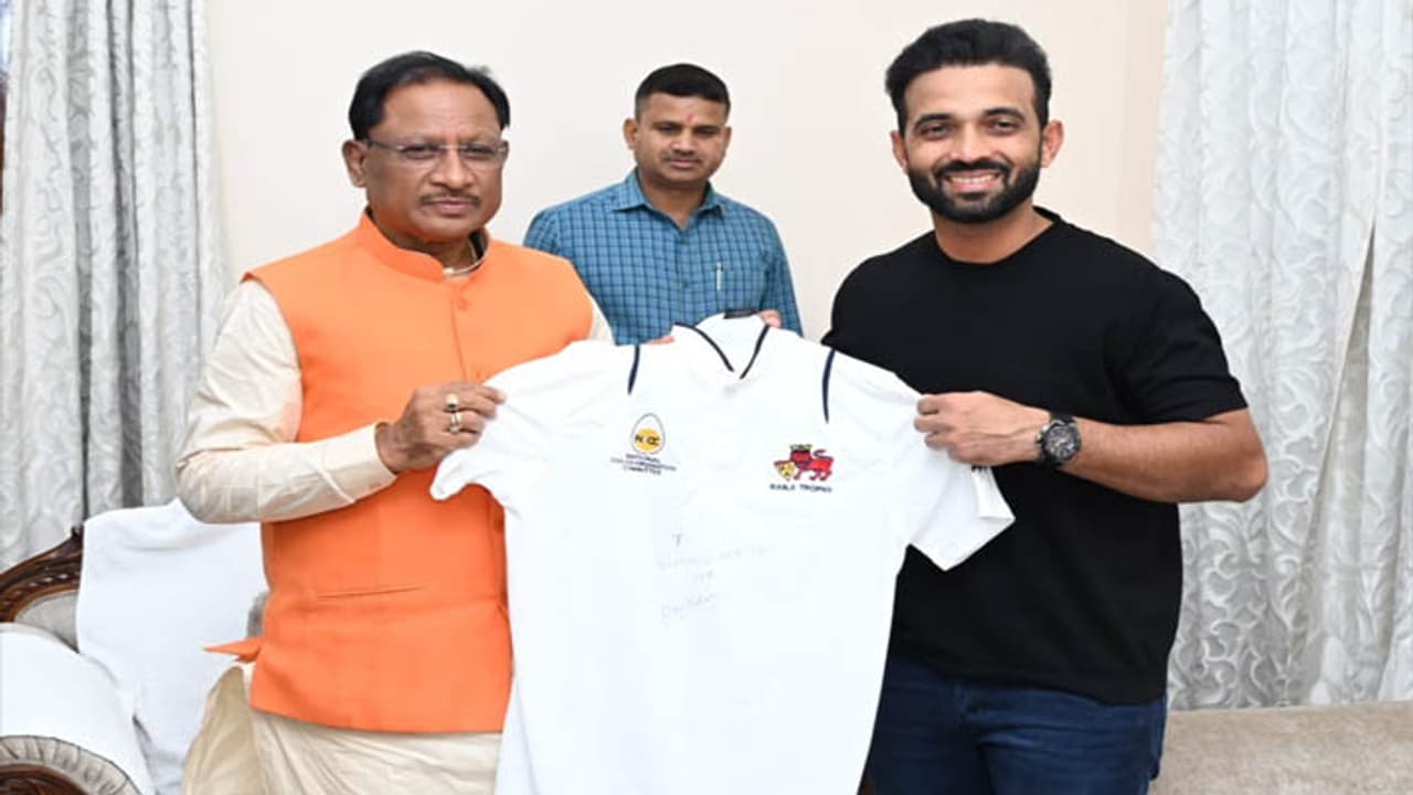 इस दौरान मुख्यमंत्री श्री साय ने श्री रहाणे को बेल मेटल से निर्मित मूर्ति और शॉल भेंट कर उनका अभिनन्दन किया। श्री रहाणे ने मुख्यमंत्री को सम्मानपूर्वक मुंबई रणजी टीम का टी-शर्ट और अपना हस्ताक्षर किया हुआ बल्ला भेंट किया। इस अवसर पर मुख्यमंत्री के सचिवद्वय श्री पी. दयानन्द और श्री बसवराजू एस. भी मौजूद थे।