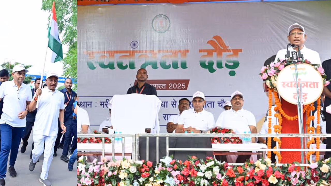 Tiranga Unity Message के साथ CM विष्णु देव साय ने रायपुर के मरीन ड्राइव में स्वतंत्रता दौड़ में हजारों युवाओं संग दौड़ लगाई। तिरंगे की शान, पूर्वजों के बलिदान और विकसित छत्तीसगढ़ विज़न 2047 को जन-जन तक पहुंचाने का आह्वान किया गया।