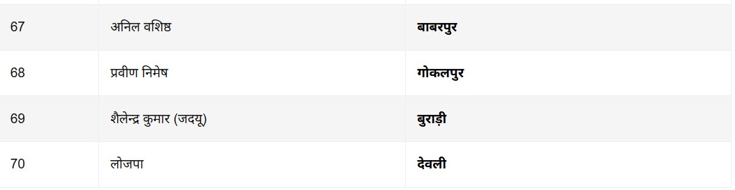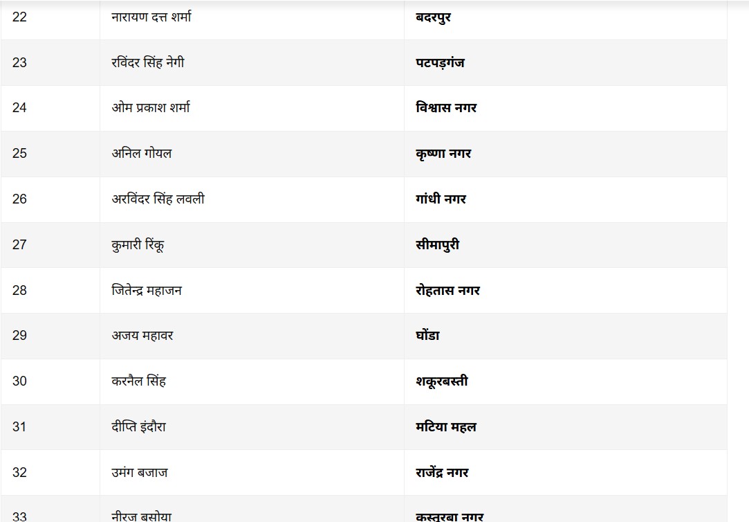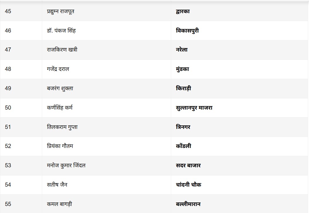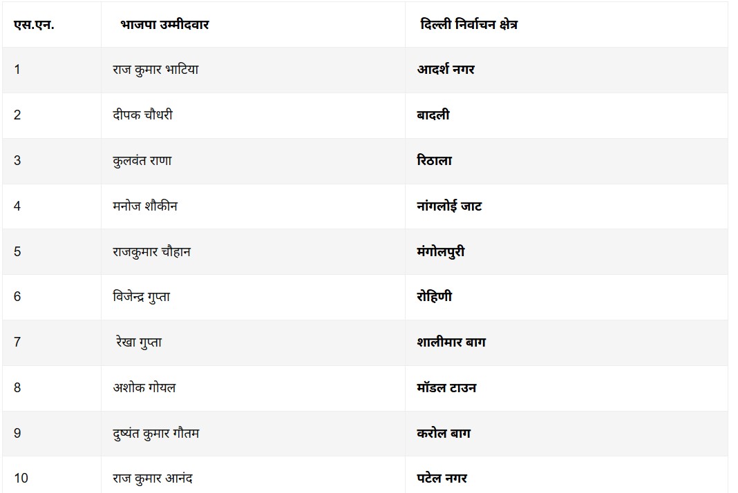 नई दिल्ली। दिल्ली विधानसभा चुनाव 5 फरवरी से होने जा रहे हैं। इससे पहले बीजेपी, आम आदमी पार्टी औऱ कांग्रेस के बीच जमकर घमासान देखने को मिल रहा है। बीजेपी ने 70 में से अपनी 68 सीटों पर उम्मीदवारों को उतार दिया है। पार्टी की तरफ से गुरुवार के दिन चौथी लिस्ट जारी की गई थी, जिसमें कई चेहरों को जगह दी गई। लेकिन दो सीटों को बीजेपी ने अपनी सहयोगी पार्टियों जेडीयू और एलजेपी (रामविलास) के लिए छोड़ी है। इन सीटों के नाम बुराड़ी और देवली है। ऐसे में आइए जानते हैं कि कौन-कौन सी 68 सीटों पर बीजेपी ने उतारे कौन-कौन से उम्मीदवार।