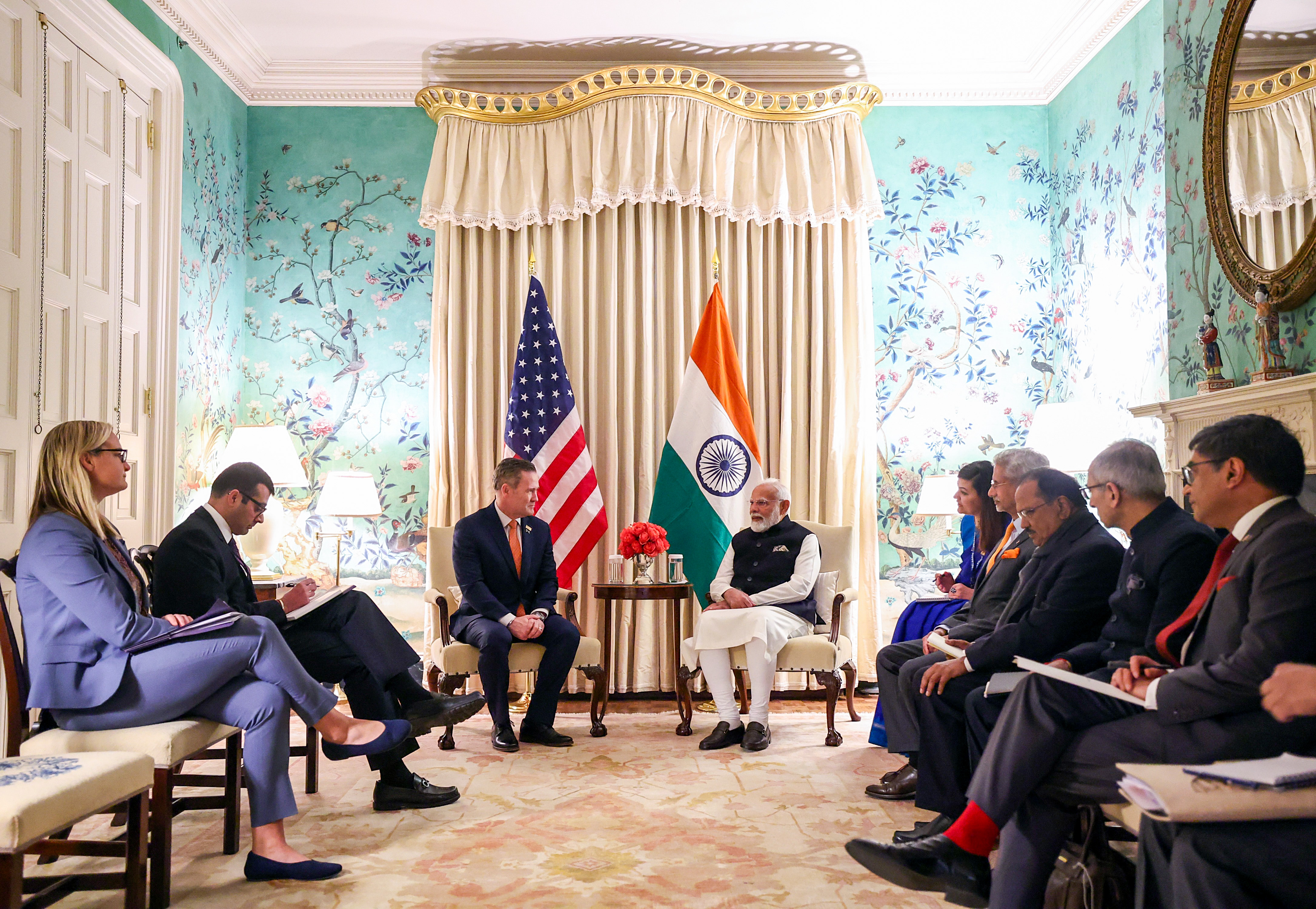 प्रधानमंत्री नरेंद्र मोदी ने गुरुवार को वाशिंगटन डीसी के ब्लेयर हाउस में संयुक्त राज्य अमेरिका के राष्ट्रीय सुरक्षा सलाहकार माइकल वाल्ट्ज से मुलाकात की। बैठक में विदेश मंत्री एस जयशंकर और एनएसए अजीत डोभाल भी मौजूद रहे।