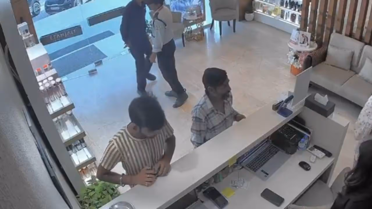 वीडियो में एक नौजवान दुकान के रिसेप्शन के सामने खड़ा दिख रहा है। उसके पास एक और शख्स भी खड़ा है। रिसेप्शनिस्ट उन दोनों से बात कर रही है।