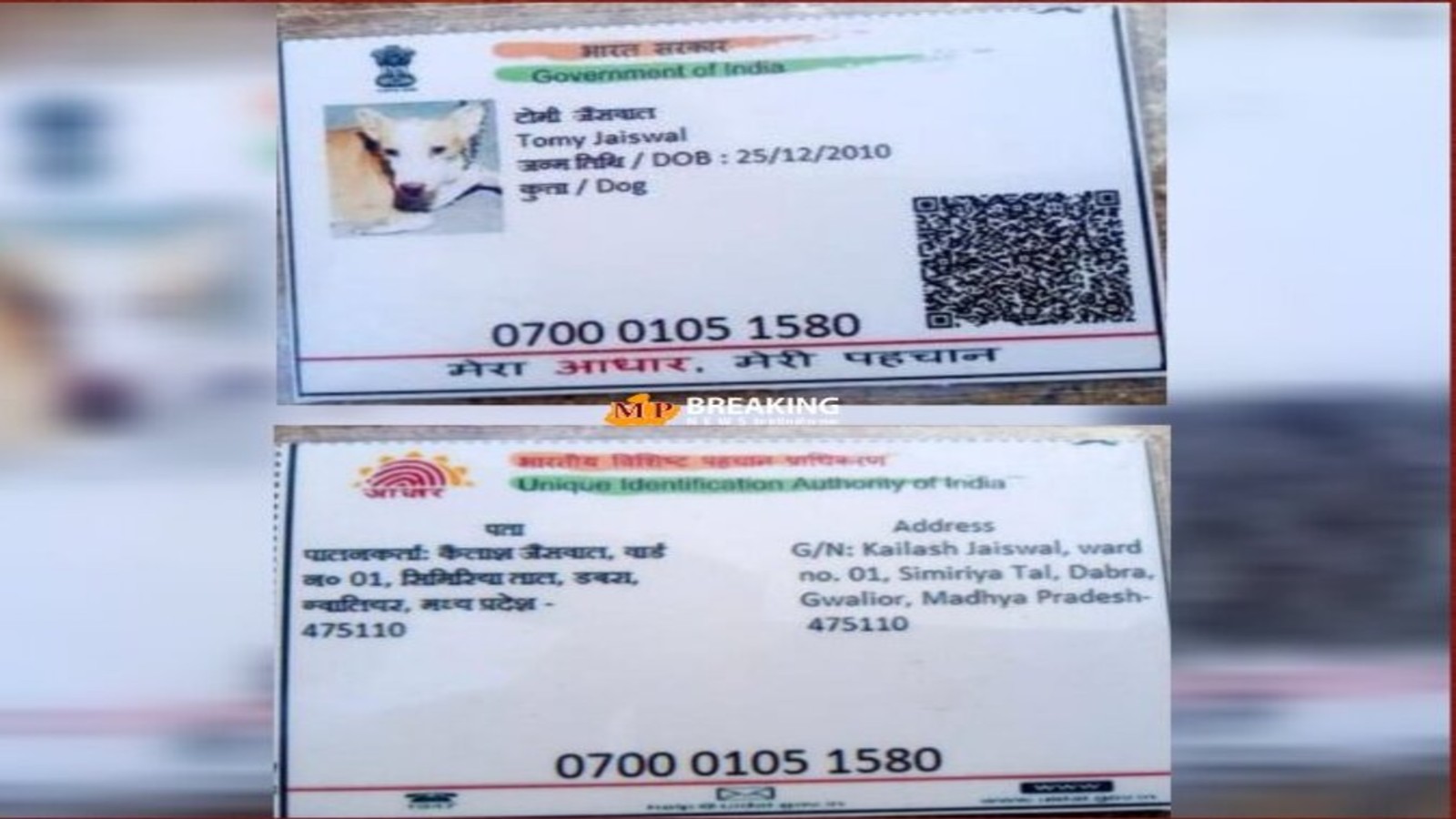 वायरल कार्ड में कुत्ते का नाम टोमी जैसवाल, पिता का नाम कैलाश जैसवाल, और जन्मतिथि 25/12/2010 दर्ज है। वहीं, पता वार्ड नंबर एक, सिमरिया ताल, ग्वालियर, मध्य प्रदेश दिखाया गया है। कार्ड में आधार संख्या भी दी गई है: 070001051580। सोशल मीडिया पर यह कार्ड तेजी से वायरल हो गया है, और लोग यह जानने की कोशिश कर रहे हैं कि आखिरकार यह कैसे संभव हुआ।