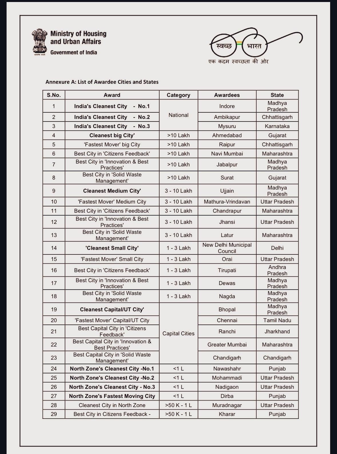 देश के 29 सबसे क्लीनेस्ट शहरों के नाम कुछ इस प्रकार है...