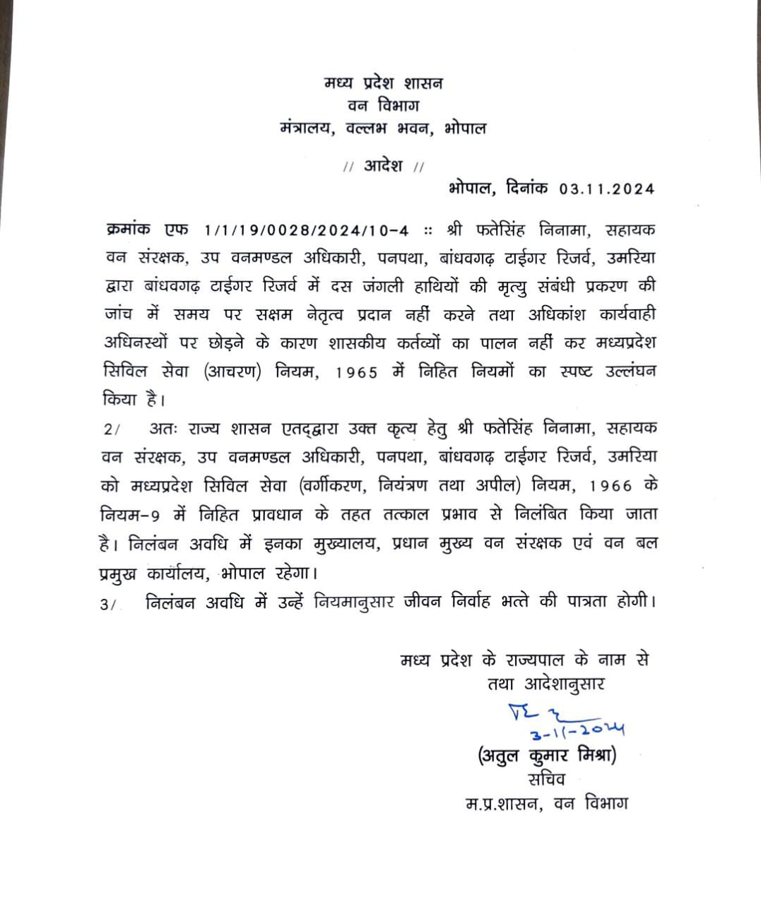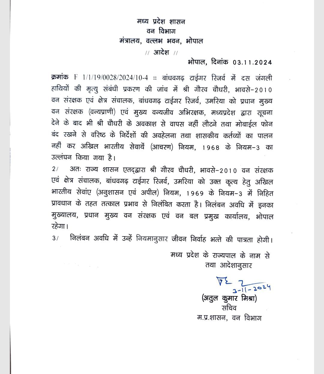 मुख्यमंत्री डॉ यादव ने कहा कि हाथियों की मृत्यु की इतनी बड़ी घटना के समय फील्ड डायरेक्टर का अवकाश से वापस न आना और पूर्व में हाथियों के दल आने के संदर्भ में जो आवश्यक चिंता की जाना चाहिए, वह नहीं की गई। इस लापरवाही के लिए फील्ड डायरेक्टर गौरव चौधरी को सस्पेंड किया गया है। साथ ही प्रभारी एसीएफ फतेहसिंह निनामा को भी निलंबित किया गया है।