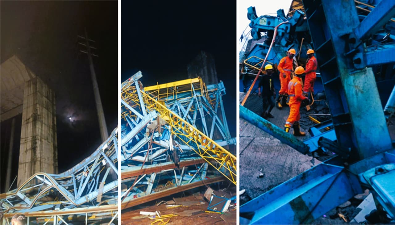 ये तस्वीरें महाराष्ट्र के ठाणे में शाहपुर के पास महत्वाकांक्षी प्रोजेक्ट 'समृद्धि एक्सप्रेस हाईवे' पर सोमवार(31 जुलाई) देर रात सरलांबे पर बन रहे पुल से एक गर्डर लॉन्चिंग मशीन टूटने के बाद की हैं। इस भीषण हादसे में 17 मजदूरों की मौत हो गई।