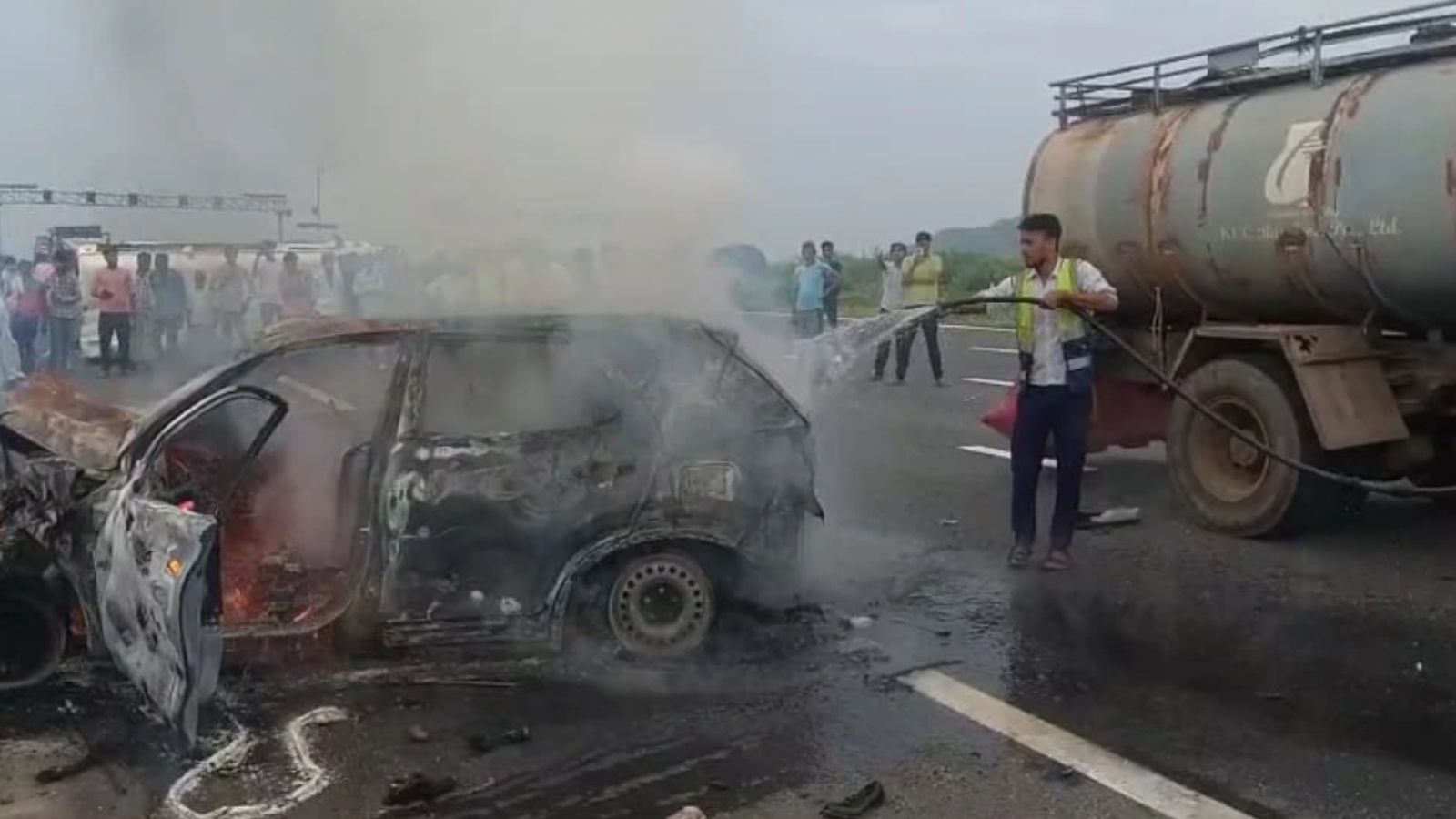 delhi mumbai expressway accident : मंगलवार सुबह दिल्ली-मुंबई एक्सप्रेसवे पर अलवर जिले के पिनान के पास एक भीषण सड़क हादसा हो गया। तेज रफ्तार में आ रही एक कार ने पुलिस वैन को पीछे से जोरदार टक्कर मार दी। टक्कर इतनी जोरदार थी कि कार में तुरंत आग लग गई और वह कुछ ही मिनटों में जलकर राख हो गई। हादसे में सात पुलिसकर्मियों सहित 14 लोग घायल हुए हैं, जिनमें चार बच्चे भी शामिल हैं। तीन घायलों की हालत नाजुक बताई जा रही है।