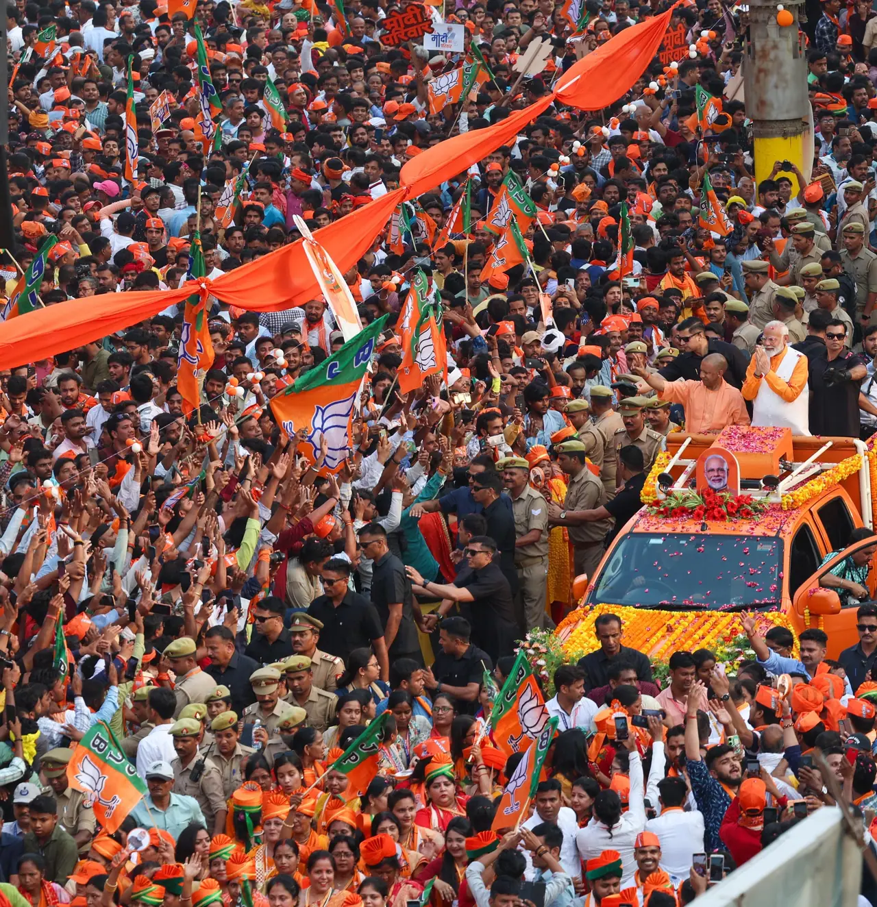 पीएम नरेंद्र मोदी के रोड शो वाले रास्ते के दोनों तरफ हजारों की संख्या में लोग खड़े होकर अभिवादन कर रहे थे। छह किलोमीटर के रास्ते में किनारे दोनों तरफ जगह-जगह मंच बनाए गए थे।