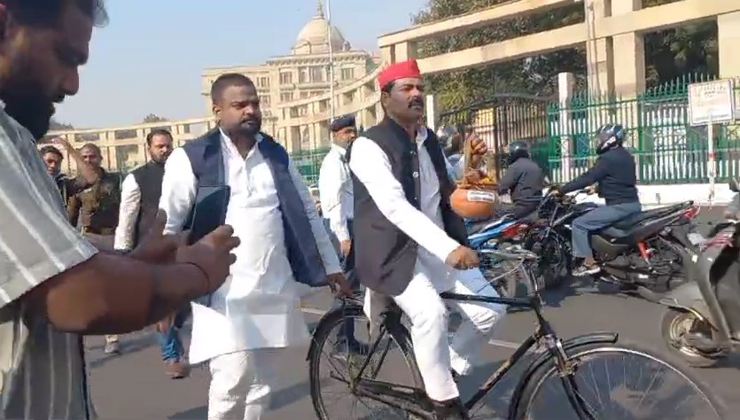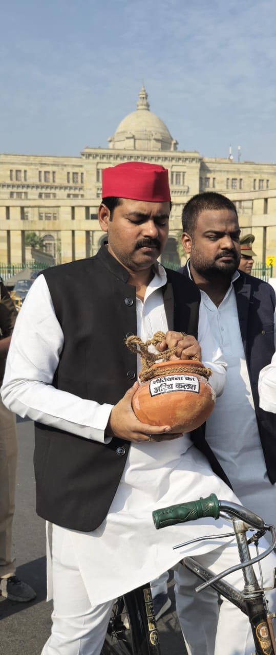 UP Vidhan Sabha session: समाजवादी पार्टी (Samajwadi Party) के विधान परिषद सदस्य (MLC) आशुतोष सिन्हा (Ashutosh Sinha) और विधायक अतुल प्रधान (Atul Pradhan) ने मंगलवार को उत्तर प्रदेश विधानसभा (UP Assembly) में अनोखे अंदाज में विरोध जताया। आशुतोष सिन्हा विधानसभा में 'नैतिकता का अस्थि कलश' (Mortal Remains of Morality) लेकर साइकिल से पहुंचे तो अतुल प्रधान प्रतीकात्मक बेड़ियां लगाकर अमेरिका से अपमानित होकर वापस भेजे जा रहे भारतीयों का मुद्दा उठाया। सिन्हा ने योगी आदित्यनाथ (Yogi Adityanath) सरकार पर कुंभ भगदड़ (Kumbh Stampede) में हुई मौतों के आंकड़े छुपाने का आरोप लगाया।