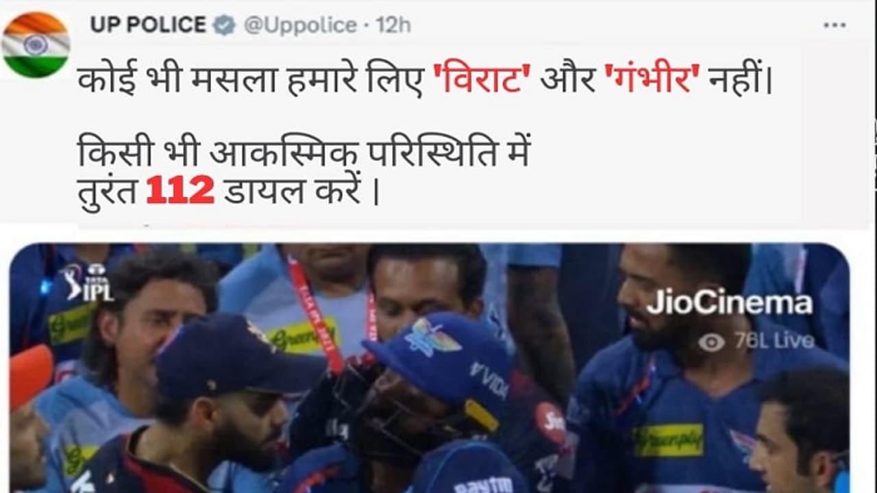 विराट कोहली और गौतम गंभीर के बीच मैच के दौरान हुई बहस को लेकर यूपी पुलिस ने ट्वीट किया है। यूपी पुलिस के ट्वीट पर लोग जमकर मजे ले रहे हैं। लोग पुलिस की क्रिएटिविटी की भी सराहना कर रहे हैं।