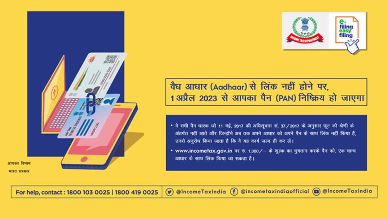 हाल ही में इनकम टैक्स विभाग ने पैन कार्ड होल्डर्स के लिए पैन-आधार लिंकिंग को लेकर चेतावनी जारी की है। इस चेतावनी ने आईटी डिपार्टमेंट ने कहा है, 'आयकर अधिनियम, 1961 के अनुसार, पैन को आधार से लिंक करने की अंतिम तिथि, उन सभी पैन धारकों के लिए जो छूट की श्रेणी में नहीं आते हैं, 31.3.2023 है। पैन को आधार से लिंक न करने पर पैन निष्क्रिय हो जाएगा। देर न करें, आज ही लिंक करें!'