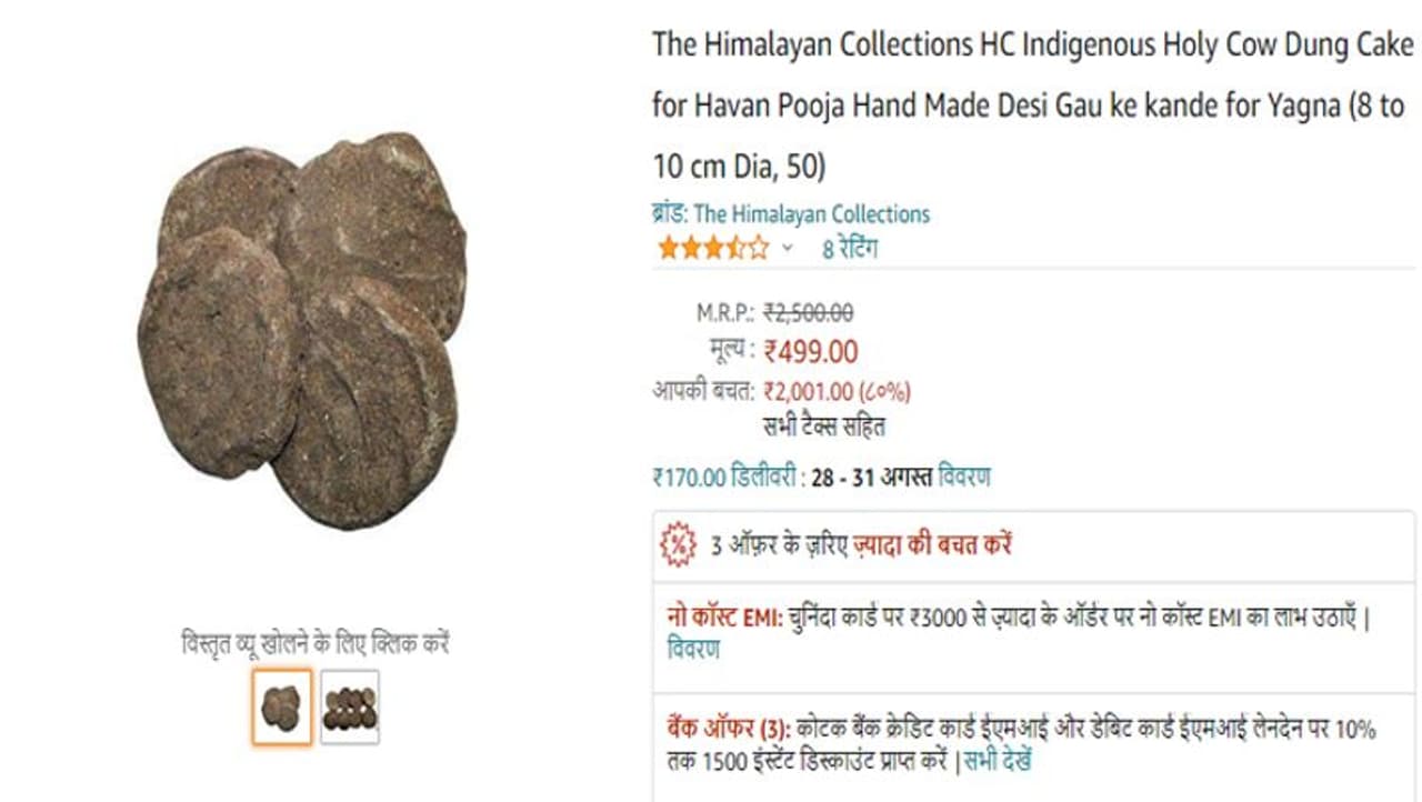 Amazon पर अब आप गाय का गोबर (cow dung cakes), आम के पत्ते (mango leave), बेलपत्र और ऐसी ही अन्य चीजें ईएमआई पर खरीद सकते हैं। इसपर भारी छूट भी मिल रही है।