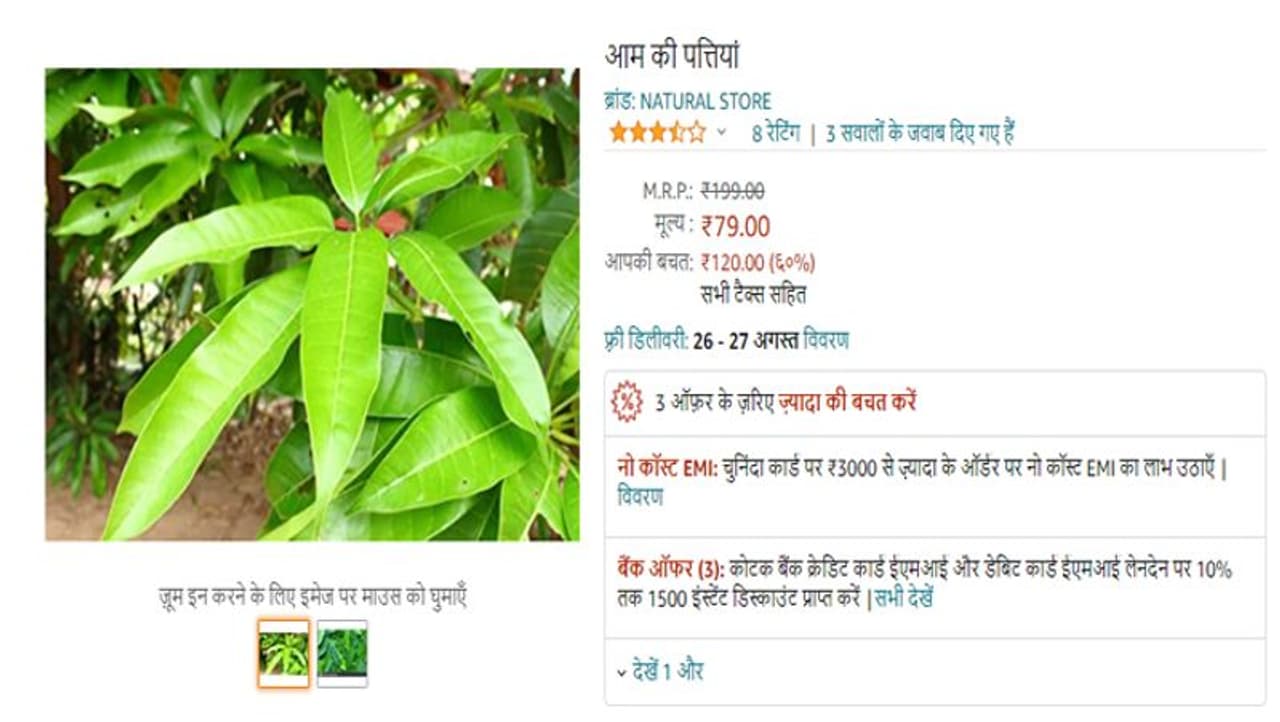 अमेजन (amazon) कई चीजों पर ऑफर्स भी दिए जा रहे हैं। इसमें आम के पत्ते जो साइट पर 199 रुपये के है, वह डिस्काउंट के बाद 79 रुपये में बिक रहे हैं। वहीं, गोबर के उपलों की कीमत 2,500 रुपये प्रति 500 पीस है। हालांकि ये आपको 70% डिस्काउंट के साथ 499 रुपये में मिल रहे है। इसी तरह पूजा में इस्तेमाल होने वाले बेलपत्र को 444 रुपये, तुलसी के पौधे को 299 रुपये और गोमूत्र को 249 रुपये में बेचा जा रहा है।