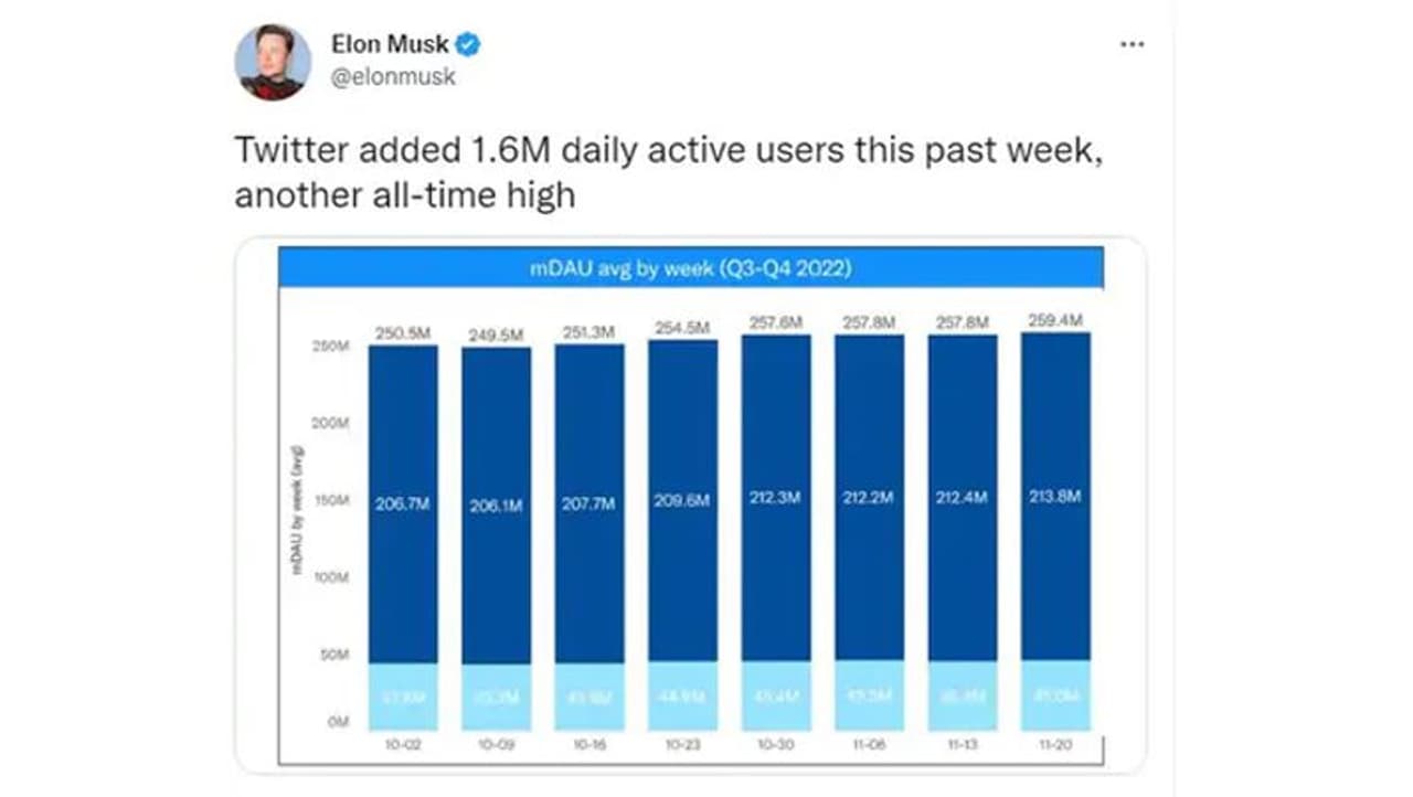 मस्क द्वारा शेयर किए गए ग्राफ के अनुसार, डेली एक्टिव यूजर्स में बढ़त अक्टूबर के अंत से होना शुरू हुई है, जब से मस्क ने प्लेटफॉर्म की कमान संभाली है। इसके बाद यह बढ़ते हुए 259.4 मिलियन के पीक पर पहुंच गया।