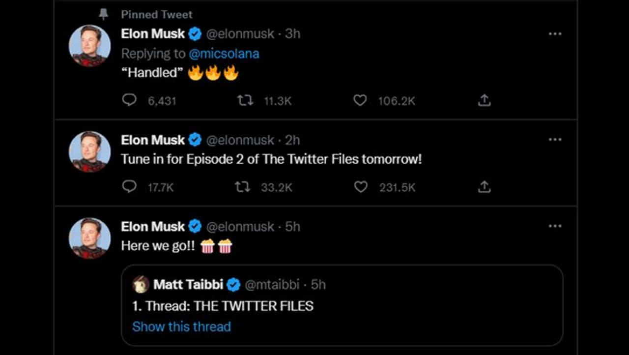 एसन मस्क ने इंडिपेंडेंट रिपोर्टर और राइटर मैट टैबी (Matt Taibbi) के अकाउंट का लिंक ट्वीट किया जिसमें उन्होंने हंटर बाइडेन (जो बाइडेन के बेटे) की लैपटॉप स्टोरी की सेंसरशिप के पीछे के फैसले के बारे में खुलासा करते हुए ट्वीट्स की एक सीरीज पोस्ट की थी। टैबी ने अपने इन ट्वीट्स में कहा- 'द ट्विटर फाइल्स, पार्ट वन: ट्विटर ने हंटर बाइडेन लैपटॉप स्टोरी को कैसे और क्यों ब्लॉक किया।' मैट ने आगे एक और ट्वीट में लिखा, '14 अक्टूबर, 2020 को न्यूयॉर्क पोस्ट ने बाइडेन के सीक्रेट ईमेल पब्लिश किए थे जो हंटर बाइडेन के लैपटॉप के कंटेंट के आधार पर एक्सपोज किए गए थे।'