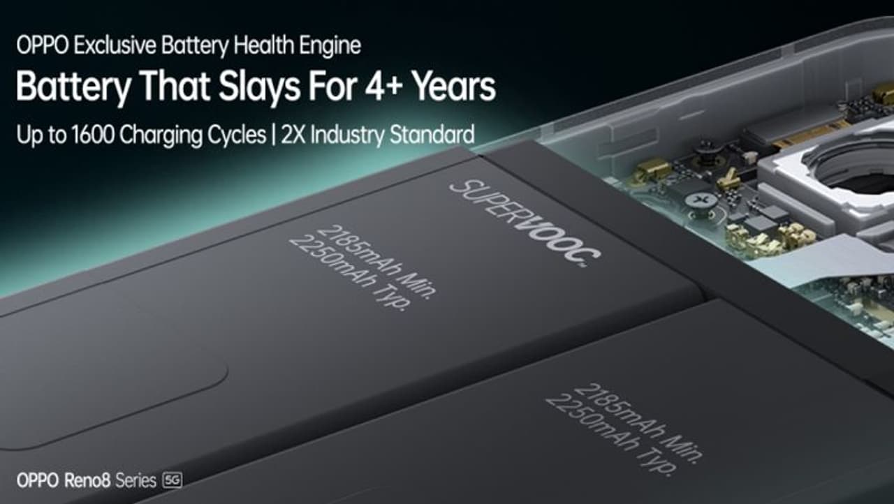 OPPO ऐसा स्मार्टफोन बनाता है, जो बैटरी चार्ज सेविंग के साथ परफॉर्म करता है। OPPO ने Reno 8 में भी इसे जारी रखा है। रेनो 8 80W सुपरबूक फ्लैश चार्ज के साथ आता है। 4500 एमएएच की बैटरी को 50% तक चार्च करने में सिर्फ 11 मिनट का समय लगता है। फोन मात्र 28 मिनट में 100% चार्ज हो जाता है। OPPO यह भी प्रॉमिस करता है कि Battery Health Engine तकनीक के साथ 4 साल बाद भी बैटरी शानदार परफॉर्म करेगी।