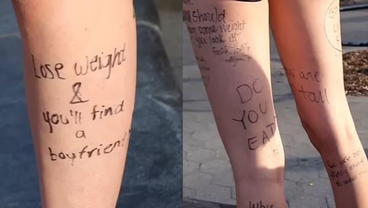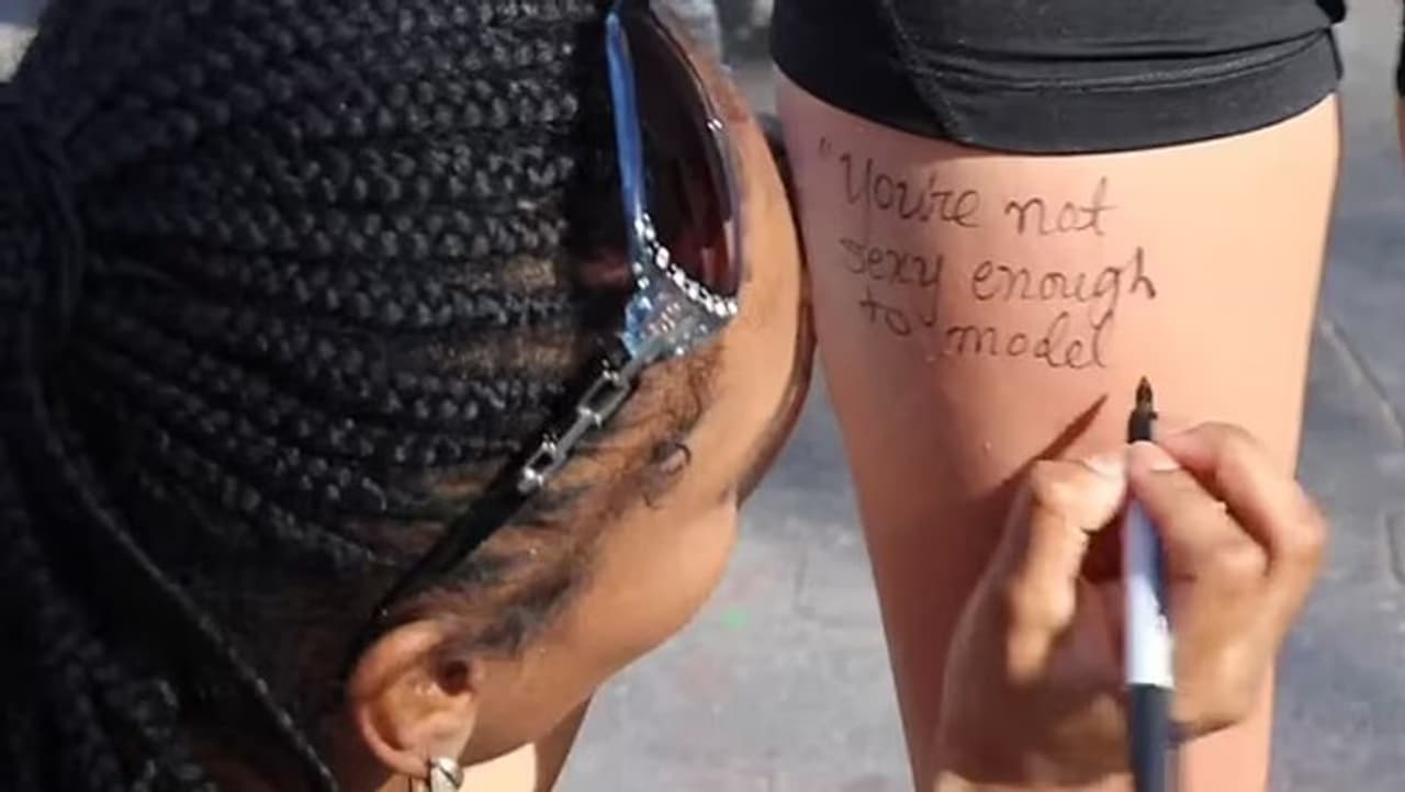 ऐनोआ ने जो अपने हाथ पर प्लेइंग कार्ड पकड़ा था, उसे पढ़कर कई लड़कियां उसके पास आई और पैन से उसके शरीर पर वह सभी बातें लिखी जो कभी ना कभी उन लोगों ने झेली थी। एक महिला ने लिखा 'मोटी मत होना।' तो वहीं दूसरी महिला ने उनकी जांघ पर लिखा 'तुम इतनी सेक्सी नहीं कि मॉडल बन सको।' वहीं एक ने लिखा 'तुम थोड़ा वजन बढ़ाओ।' वहीं एक अन्य महिला ने लिखा कि 'वजन कम करो बॉयफ्रेंड मिल जाएगा।' एक अन्य महिला ने लिखा कि 'म अपने अंडर आर्म्स को शेव क्यों नहीं करती।' इस तरह के कई भद्दे कमेंट ऐनोआ की बॉडी पर लोगों ने लिखे।