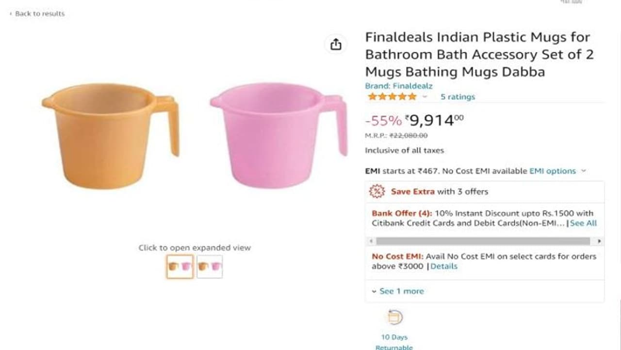 ई-कॉमर्स वेबसाइट पर एक बाल्टी की कीमत करीब 26 हजार रुपए और दो मग की कीमत करीब दस हजार रुपए तक हैं। एक यूजर ने जब इसे ट्विटर पर अमेजन से पूछा तो उनकी ओर से जवाब आया, हमें खेद है। हम इस पर करीब से नजर रखे हुए हैं।
