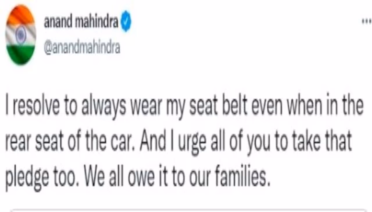 आनंद महिंद्रा ने सोशल मीडिया पर एक संकल्प लिए जाने की जानकारी दी है। उन्होंने कहा कि जब भी गाड़ी में बैठें, तब सीट बेल्ट जरूर लगाएं, चाहे आप आगे बैठ रहे हैं या फिर पीछे। मैं अब हमेशा ऐसा ही करूंगा।