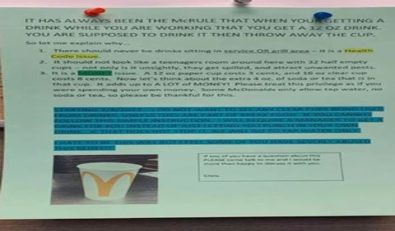 कुछ समय पहले एक शख्स को मैकडॉनल्ड के किसी रेस्त्रां में वहां के मैनेजर का अपने सहकर्मियों के लिए लिखा गया मैकरुल नोट दिखा। यूजर ने इसे तुरंत क्लिक किया और सोशल मीडिया प्लेटफॉर्म रेडिट पर इसे पोस्ट कर दिया। ये निर्देश सभी कर्मचारियों को मानने अनिवार्य थे। इस मैकरुल नोट में मैनेजर ने जो निर्देश दिए थे, वह हम आपको यहां प्वाइंटर्स में बता रहे हैं।