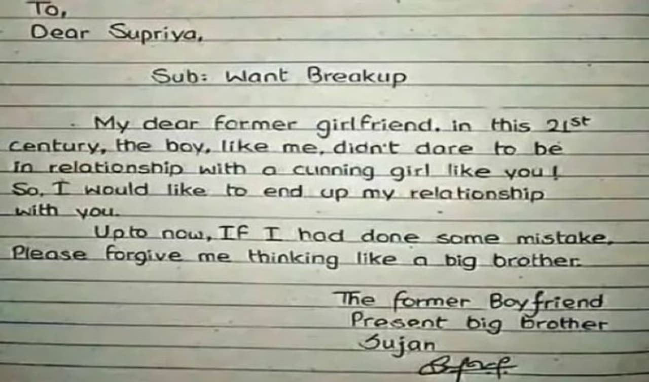 ब्रेकअप लेटर के अंत में लिखा- पूर्व ब्वॉयफ्रेंड और वर्तमान में बड़ा भाई