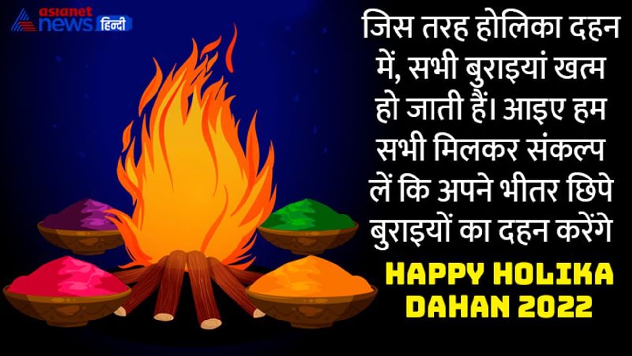 जिस तरह होलिका दहन में, सभी बुराइया खत्म हो जाती हैं। आइए हम सभी मिलकर संकल्प लें कि अपने भीतर छिपे बुराइयों का दहन करेंगे। हैप्पी होलिका दहन। Happy Holika Dahan 2022