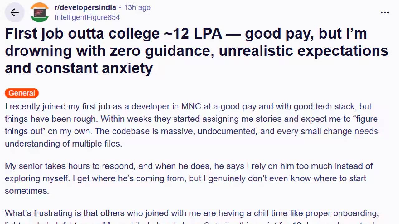 पोस्ट के मुताबिक, कंपनी का कोडबेस बहुत बड़ा और बिना डॉक्यूमेंटेशन वाला था। छोटे-मोटे बदलाव के लिए भी कई फाइलों को समझना पड़ता था। सीनियर्स से गाइडेंस बहुत धीरे-धीरे मिलती थी। अगर उनका सपोर्ट मिल भी जाए, तो भी वे कर्मचारियों से कहते थे कि दूसरों पर ज़्यादा निर्भर न रहें और खुद ही चीज़ों को समझकर काम करें।