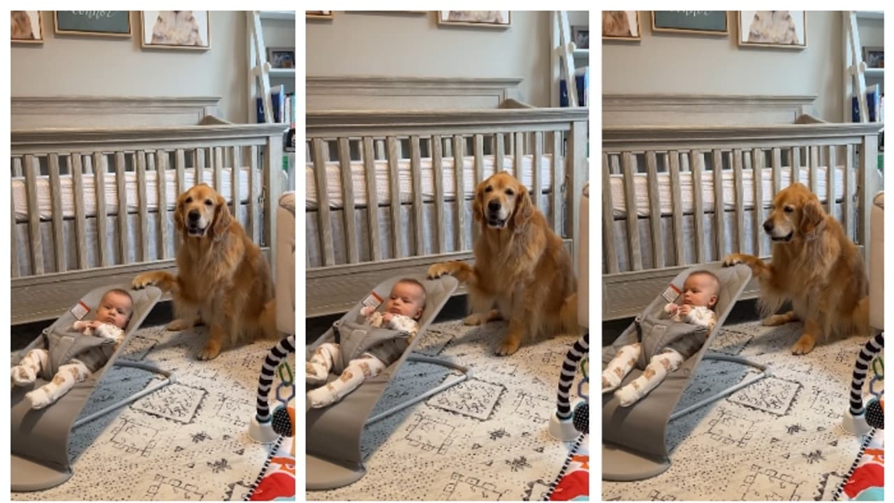 गोल्डन रिट्रीवर अपने आगे के पंजे से बच्चे के बाउंसर को धीरे-धीरे हिला रहा है। बच्चा बाउंसर की हल्की गति में चुपचाप लेटा हुआ है। 'जब आपको बच्चों की देखभाल के लिए भरोसेमंद साथी मिल जाए...' कैप्शन के साथ यह वीडियो elliegoldenlife नाम के इंस्टाग्राम पेज पर शेयर किया गया है। केविन के दो गोल्डन रिट्रीवर हैं, एली और एम्मा। उनके लिए ही उन्होंने यह इंस्टाग्राम पेज शुरू किया है।