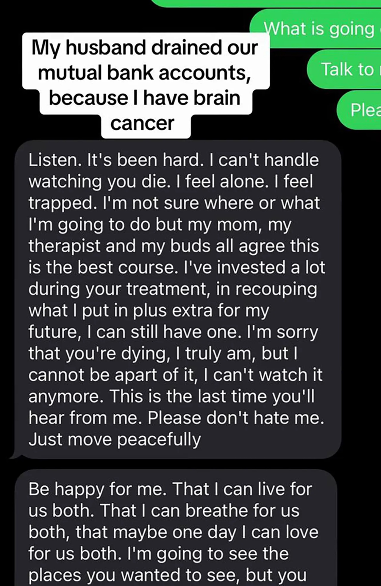 एक ऐसे ही मामले को मैरी नाम की महिला ने सोशल मीडिया प्लेटफॉर्म Reddit पर शेयर किया है। मैरी कैंसर पीड़ित हैं। पति ने संयुक्त बैंक खाते से उनके सारे पैसे निकाल लिए और मैसेज भेजकर तलाक लेने की जानकारी दे दी।