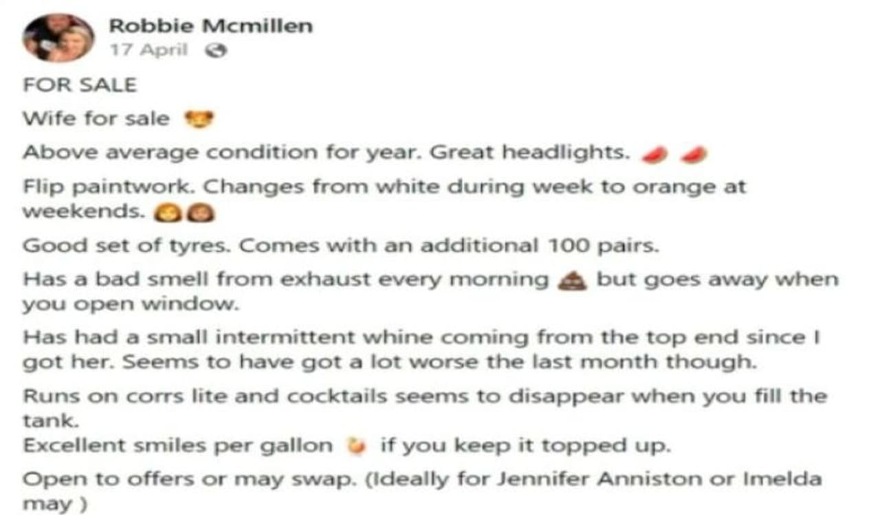 पेशे से डीजे रॉबी मैकमिलन ने सोशल मीडिया पर इस पोस्ट के साथ पत्नी सारा की फोटो भी लगाई थी। उसने इसे बाद में मजाकिया पोस्ट बताया। विज्ञापन में रॉबी ने पत्नी को खरीदने के फायदे और नुकसान दोनों बताए हैं। रॉबी ने पोस्ट में लिखा था, सारा की कंडीशन औसत से अच्छी है। टायर्स अच्छे हैं। साथ में सौ जोड़े और दिए जाएंगे।