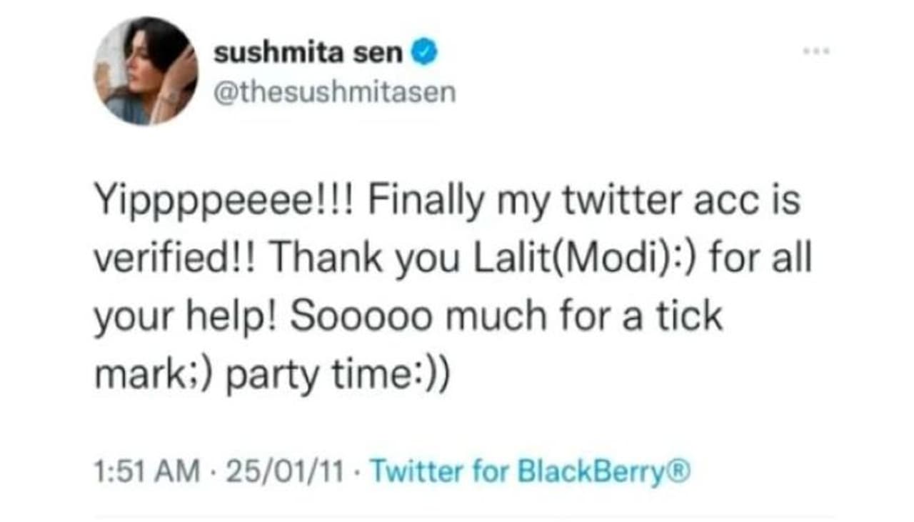 वायरल हो रहे इस ट्वीट में सुष्मिता अपने ट्विटर अकाउंट के वेरिफाइड होने यानी उसे ब्लू टिक मिलने की खुशी मना रही हैं। साथ ही, वह इसका श्रेय ललित मोदी को देते हुए कह रही हैं कि यह सब आपके बिना संभव नहीं होता। यह पार्टी टाइम है। इस ट्वीट का स्क्रीन शॉट वायरल हो रहा है, जो 25 जनवरी 2011 को पोस्ट किया गया है। इसमें सुष्मिता लिख रही हैं, येप्पी!!! आखिरकार मेरा ट्विटर अकाउंट वेरिफाइड हो ही गया!! थैंक्यू ललित (मोदी), इसके बाद इमोजी है। सब आपकी मदद से हुआ! टिक मॉर्क के लिए बहुत धन्यवाद, एक और इमोजी फिर पार्टी टाइम लिखकर दो इमोजी और दिया है।