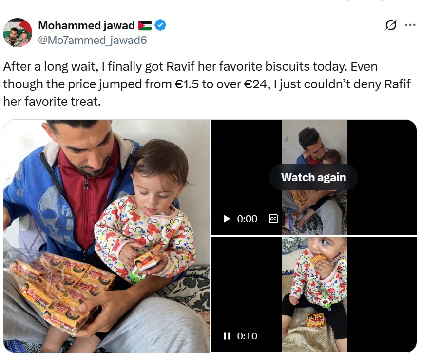 गाजा में रहने वाले फिलिस्तीनी व्यक्ति मोहम्मद जवाद ने अपनी बेटी रफीफ की तस्वीर और वीडियो शेयर किया है। वीडियो में वह पारले-जी बिस्किट का पैकेट पकड़े हुए और खाते दिख रही है। जवाद ने बताया है कि उसने इसे 24 यूरो (लगभग 2,342 रुपए) में खरीदा है।