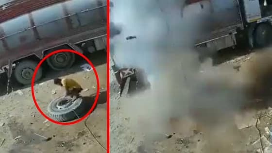 सोशल मीडिया पर एक वीडियो तेजी से वायरल हो रहा है जिसमें पंचर बनाने वाला मिस्त्री ट्रक के एक बड़े से टायर में हवा भर रहा होता है, तभी जोरदार धमाका हो जाता है।