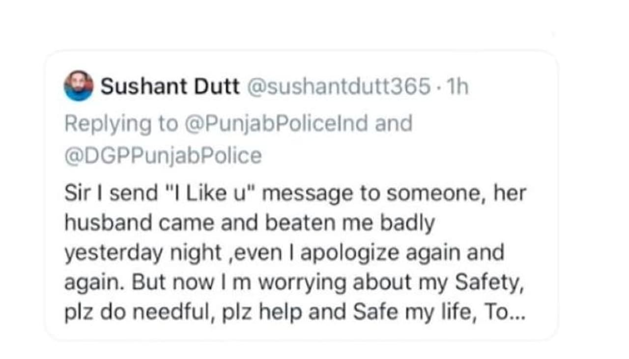 सुशांत दत्त नाम के इस यूजर ने पुलिस को किए अपने ट्वीट, जिसे बाद में उसने डिलीट कर दिया, में कहा, सर मैंने किसी को आई लाईक यू का मैसेज भेजा था। बीती रात उसका पति मेरे पास आया और बुरी तरह मेरी पिटाई की। मैंने उससे कहा भी कि मैं अपनी गलती मानता हूं और इसके लिए माफी मांगता हूं। मगर वह मुझे पीटता रहा। अब मुझे अपनी सुरक्षा को लेकर चिंता है। कृपया मेरी मदद करें। कृपया मेरा जीवन बचाइए। वे आज फिर मुझ पर हमला कर सकते हैं। इसके साथ ही सुशांत ने अमृतसर के संबंधित पुलिस स्टेशन हैशटैग किया है।