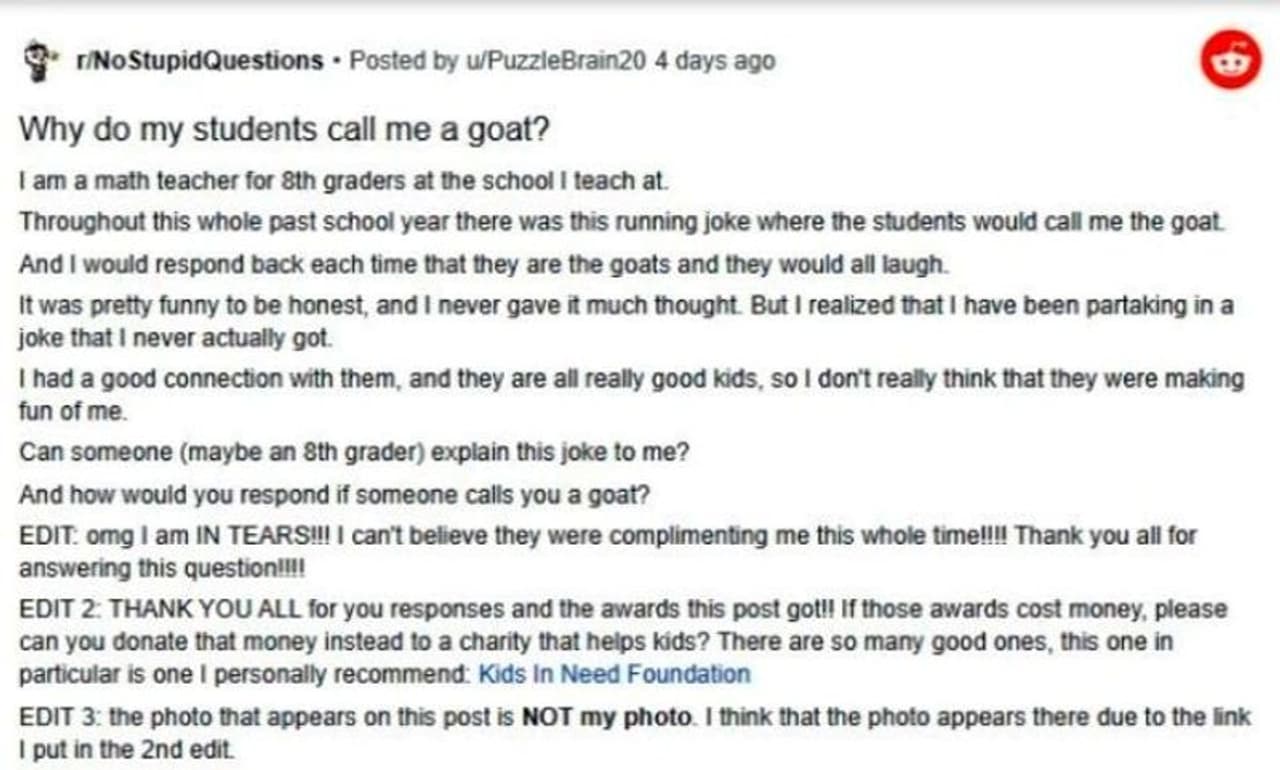 महिला टीचर स्कूल में आठवीं क्लास के बच्चों को मैथ पढ़ाती है। उसने सोशल साइट रेडिट पर लिखी एक पोस्ट में बताया कि वह इस बात को लेकर बेहद चिंतित रहती थी कि क्लास में बच्चे बहुत दिनों से उसे गोट कहकर पुकारते हैं। उसने इस बात का पता लगाने की काफी कोशिश की कि बच्चे ऐसा क्यों करते हैं। वह यह जानना चाहती थी कि बच्चे आखिर उसे गोट यानी बकरी कहकर क्यों पुकारते हैं। क्या यह मजाक है या कुछ और।