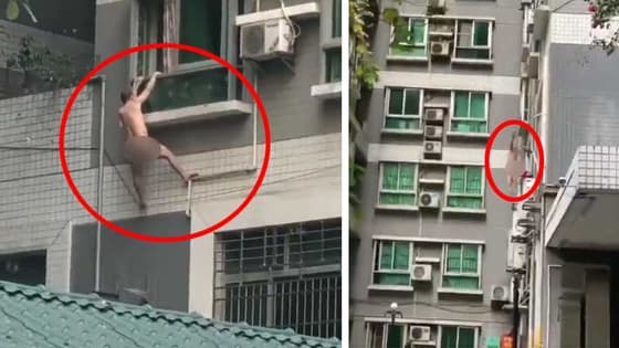 इस वीडियो में एक शख्स एक बहुमंजिला इमारत की खिड़की नग्न अवस्था में लटकता हुआ दिखता और कुछ ही सेकंड में हाथ स्लिप होने से नीचे गिर जाता है।