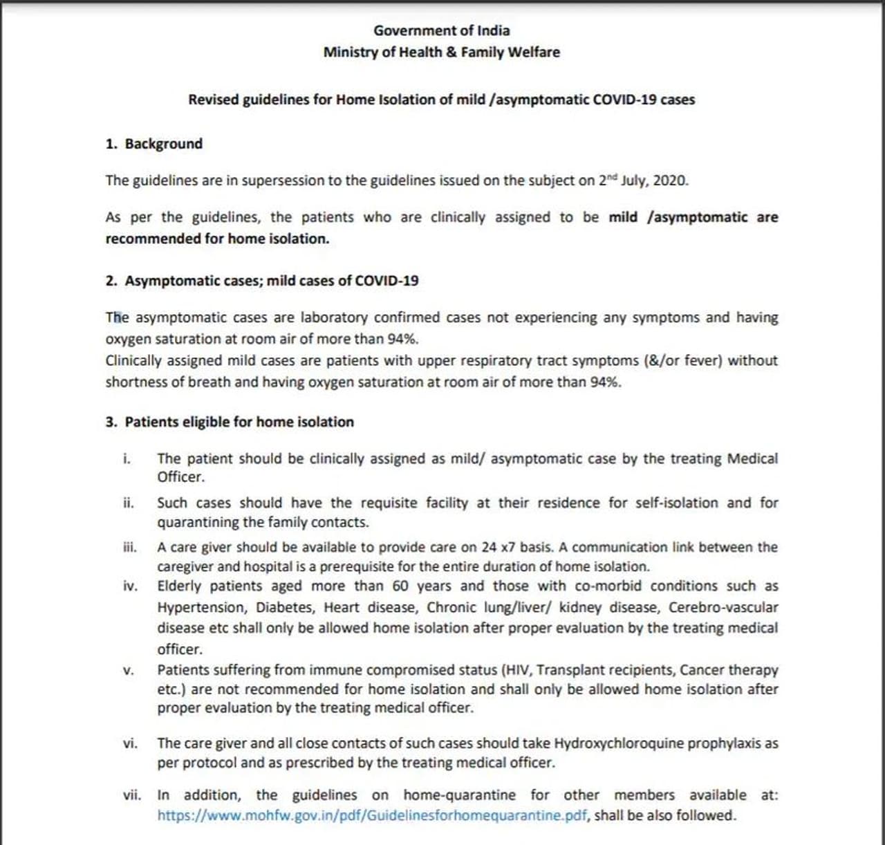 नई गाइड लाइन के मुताबिक घर में कोरोना संक्रमित व्यक्ति की पूरी देखभाल करनी होगी। साथ ही संक्रमित व्यक्ति के परिजनों को लगातार अस्पताल या डॉक्टरों के संपर्क में रहना होगा।