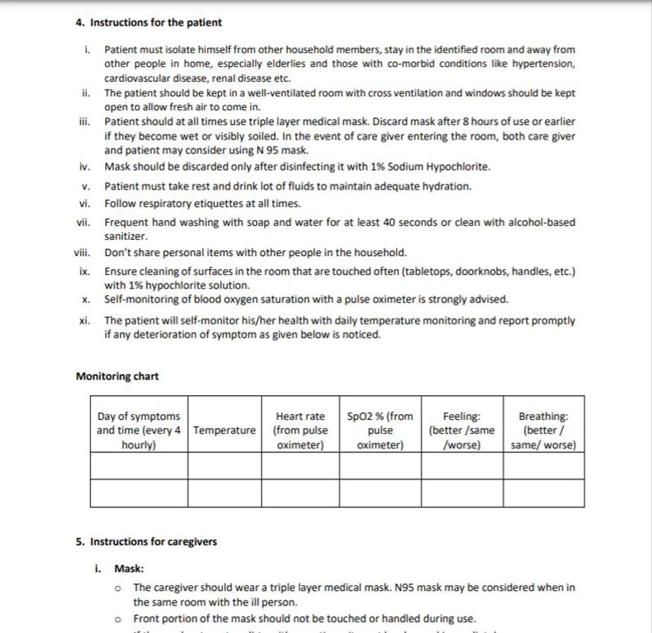 - ब्लड ऑक्सीजन सेचुरेशन को मॉनिटर करने के लिए प्लस ऑक्सीमीटर का इस्तेमाल करना अनिवार्य कर दिया गया है। साथ ही रोजाना हर 4 घन्टे पर टेम्परेचर लेना जरूरी है।